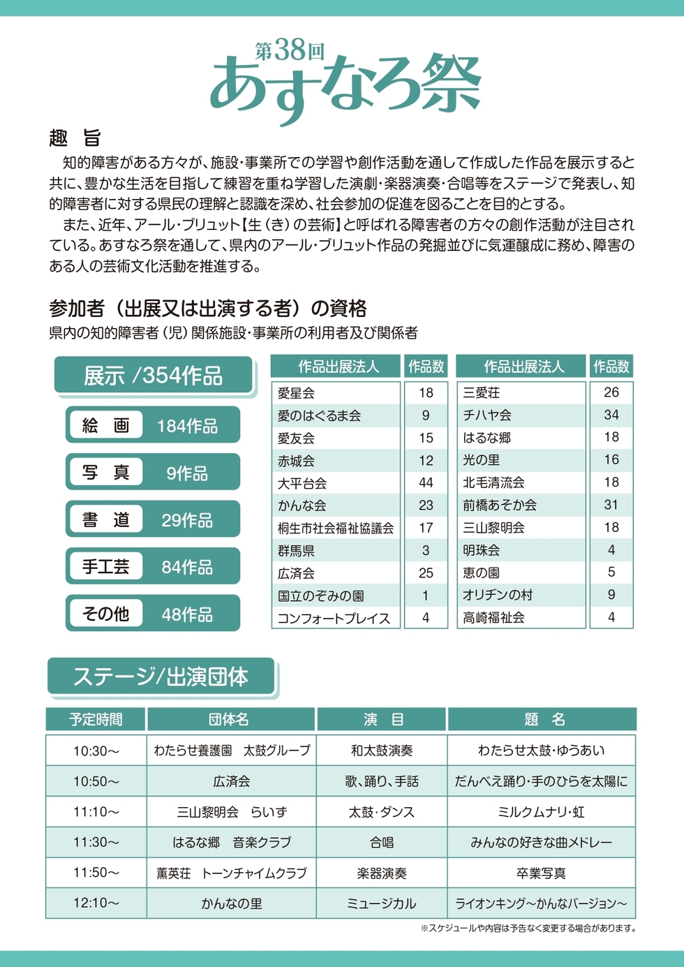 | 内容 | 展示部門 知的障害がある方々が、施設・事業所での学習や創作活動を通して制作した、絵画や書道、手工芸品、写真などを展示します。 ステージ部門 豊かな生活を目指して練習を重ねた楽器演奏や合唱、ダンス、演劇をステージで発表します。 |
